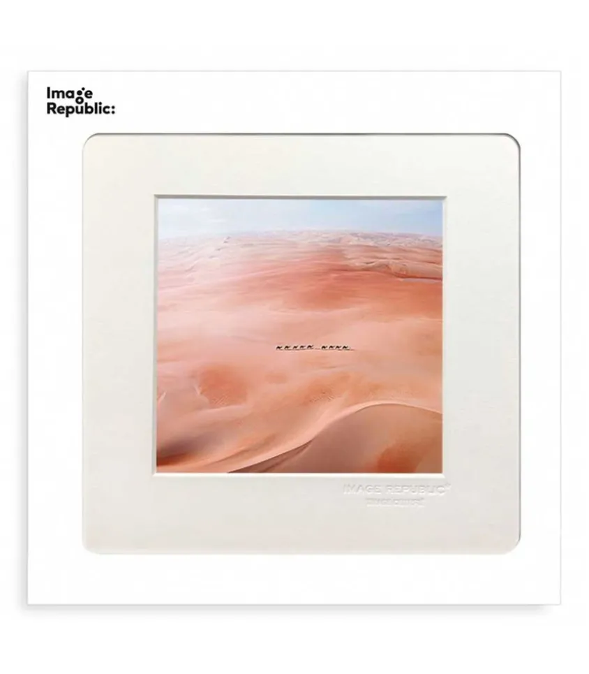 Photographie L’Iconolâtre, Référence 0299 Représentant Un Désert Aux Teintes Rosées Pris De Haut, Avec Une Ligne De Chameaux Au Centre.