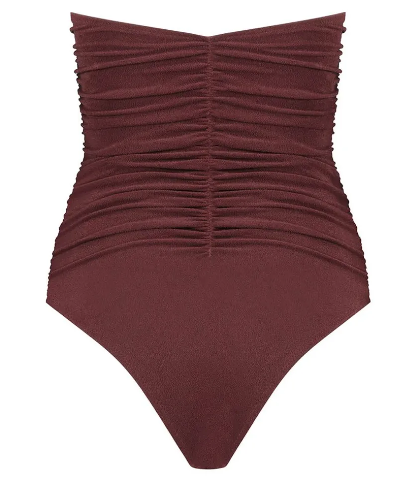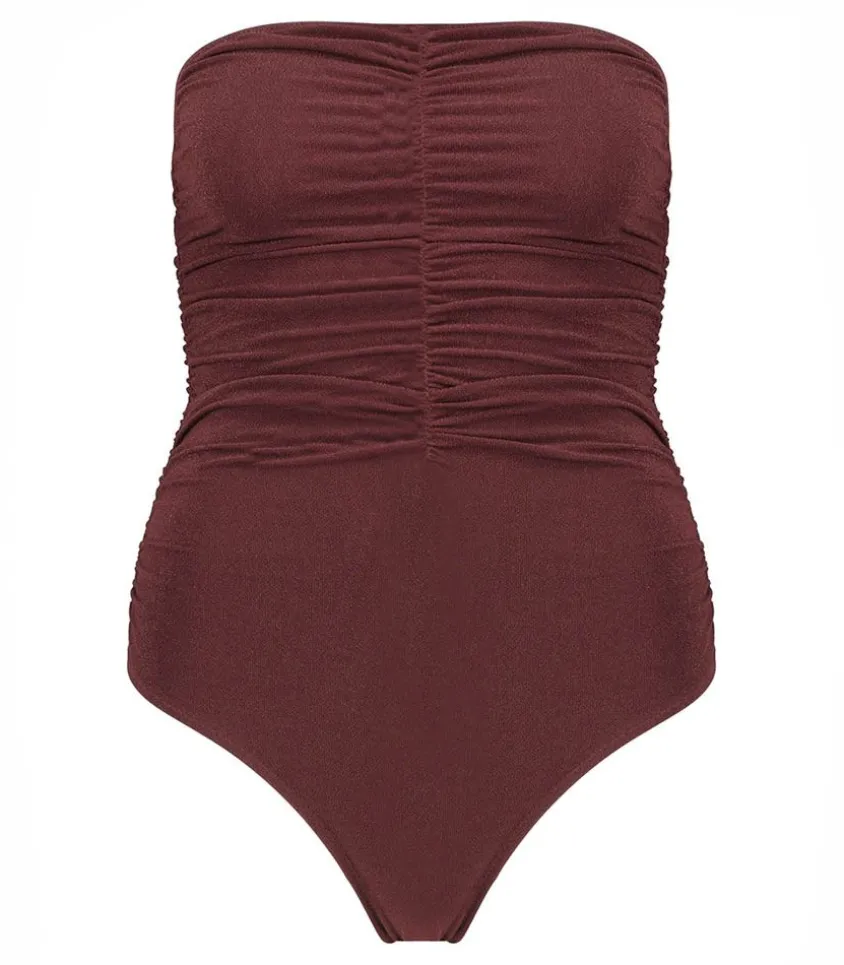 Maillot De Bain Une Pièce De Forme Bustier Signé Roseanna. Ce Modèle Ilhas Conçu En Matière Crèpe Élégante Aborde Un Coloris Cerise Profond.