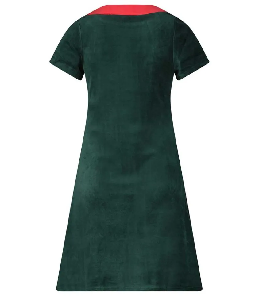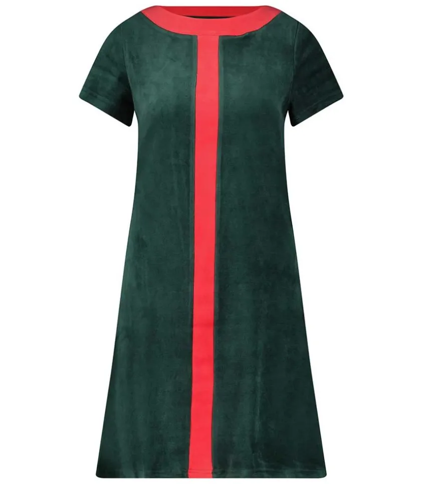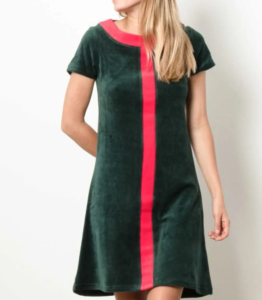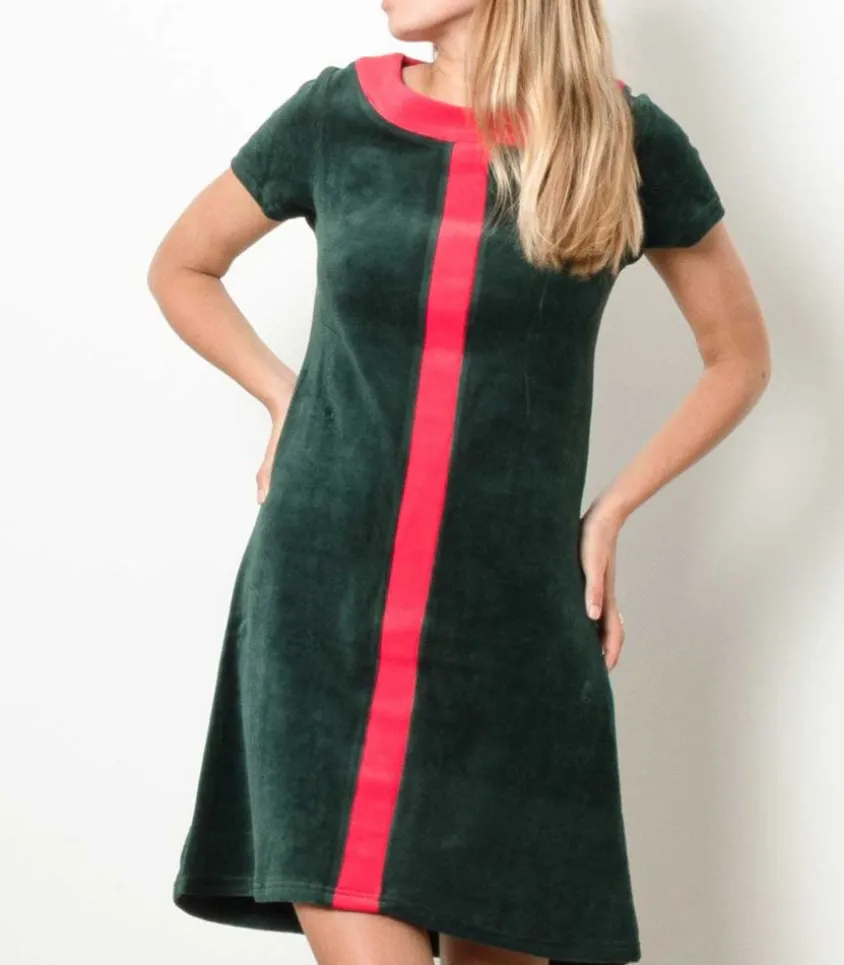 Inspirée De L’Iconique Diana Riggs, La Robe Diana De La Marque Ma Petite Plage Se Pare D’Un Velours Éponge Vert Foncé Traversé En Son Milieu Par Une Large Bande Rouge Également Présente Sur Le Col.