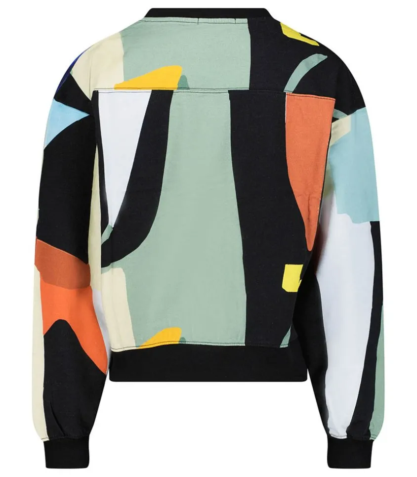 Sweat-Shirt Jaguar Crop De La Marque G.Kero, Un Modèle À La Coupe Carrée Pour Femme. Porté Avec Un Bas Taille Haute, Il Mettra En Valeur La Silhouette. Dessin Formes Abstraites Colorées Sur Fond Noir.