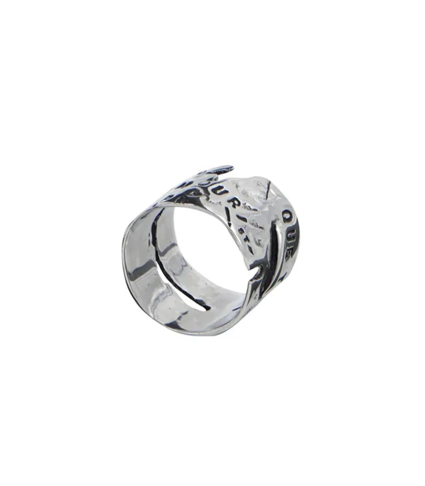 Issue De La Collection Des Intemporels, La Bague « Fragments » Par Serge Thoraval Est Fabriquée À La Main En France En Argent Premier Titre. Ce Modèle D’Aspect Brut Est Gravé De Fragmentes De Phrases.