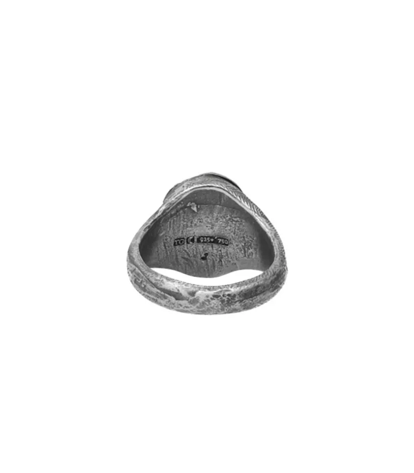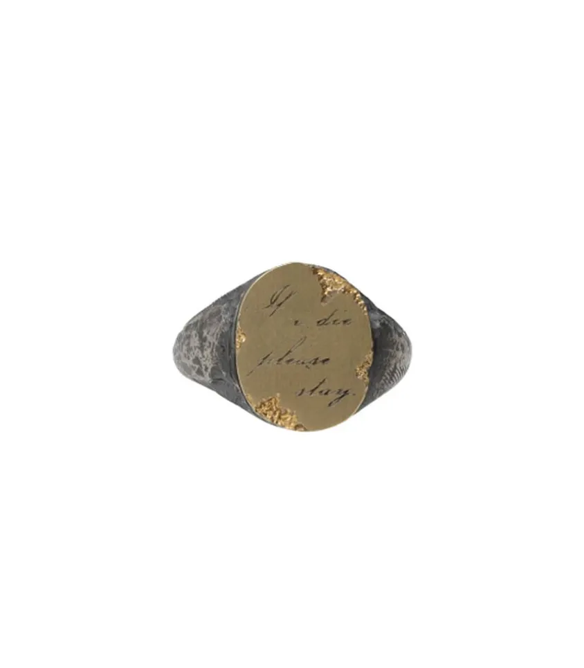 Bague Please Stay De La Marque Tó Garal, Une Bague Chevalière D’Aspect Brut Et Vieilli Qui Présente Un Mélange D’Argent Sterling Et D’Or 18K, Ainsi Qu’Une Gravure « If I Die Please Stay ».