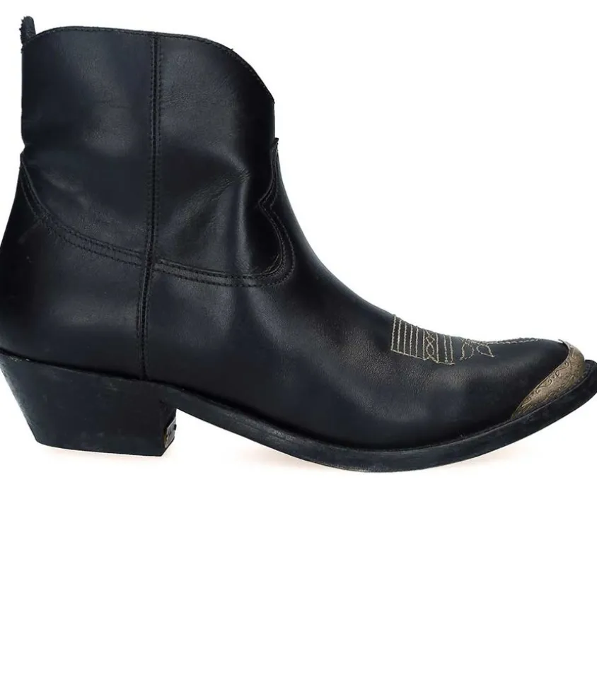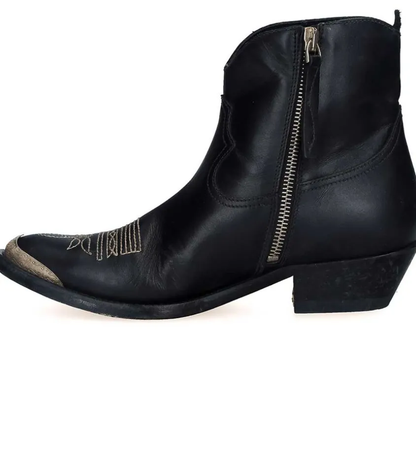 Boots À Talons Young Leather Upper Black Signées Golden Goose En Cuir De Vachette, Coloris Noir Et Fermeture Éclair Sur Le Côté. Ces Bottes D’Inspiration Western Se Démarquent Par Les Broderies Délicates Sur Le Bout De La Chaussure. Ces Bottes Sont Fabriquées À La Main En Italie.