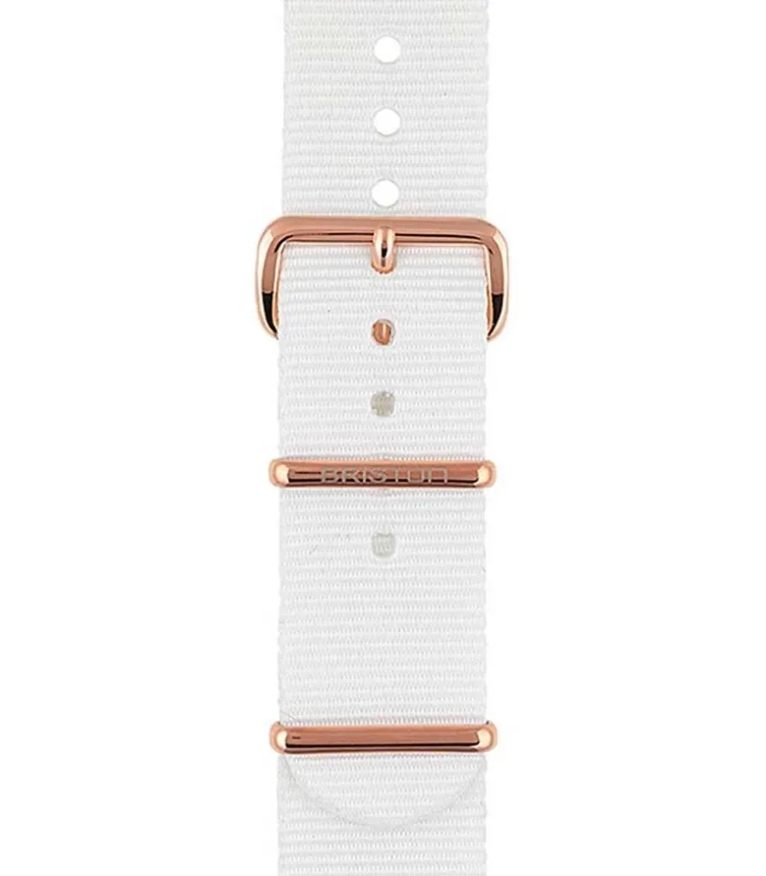 Personnalisez Votre Montre Briston Avec Ce Bracelet Blanc Et Or Rose De Type Nato. Modèle Intemporel Qui S’Adaptera Parfaitement À L’Ensemble De Vos Tenues.