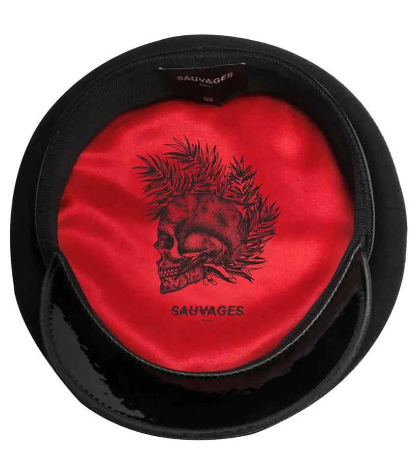 Chaque Casquette Sauvages Paris Est Reconnaissable Par Sa Broderie « = » Rouge Sur Le Côté Et Par Sa Doublure Satinée Rouge Et Imprimée D’Une Tête De Mort Ou D’Un Papillon Dessiné À La Main Et Imprimé Sur La Matière.