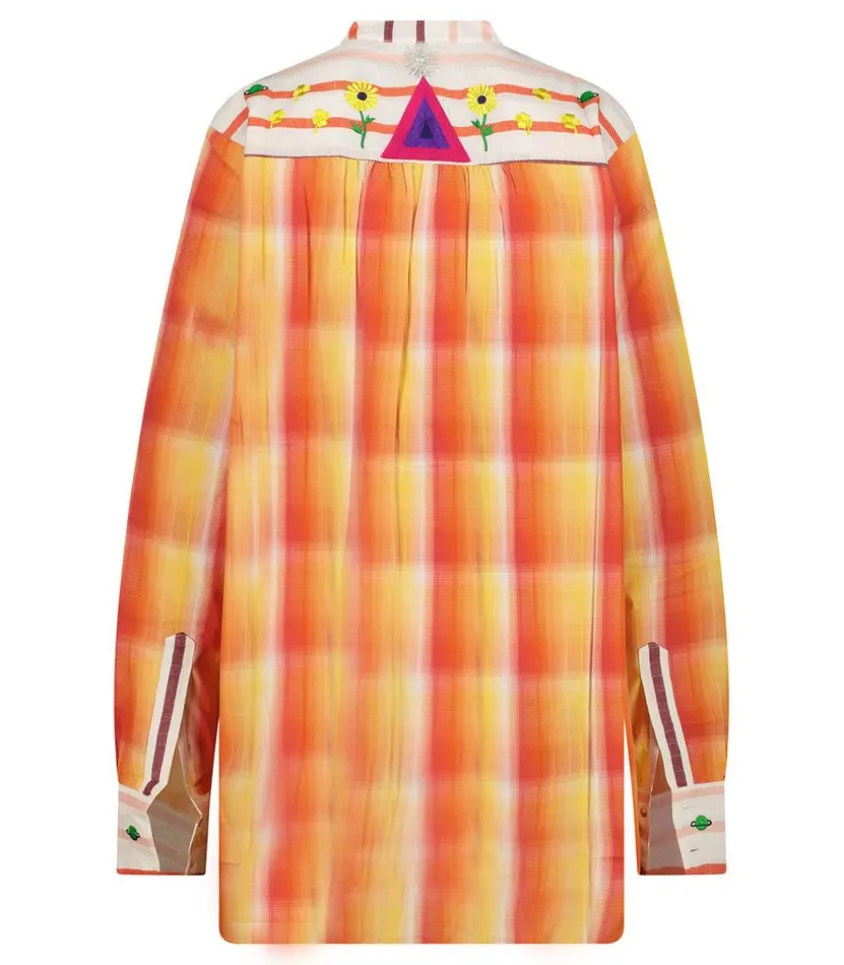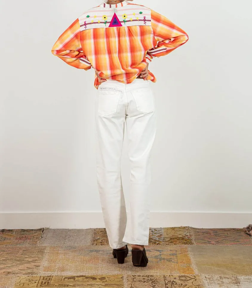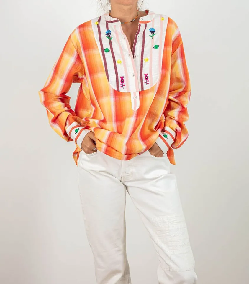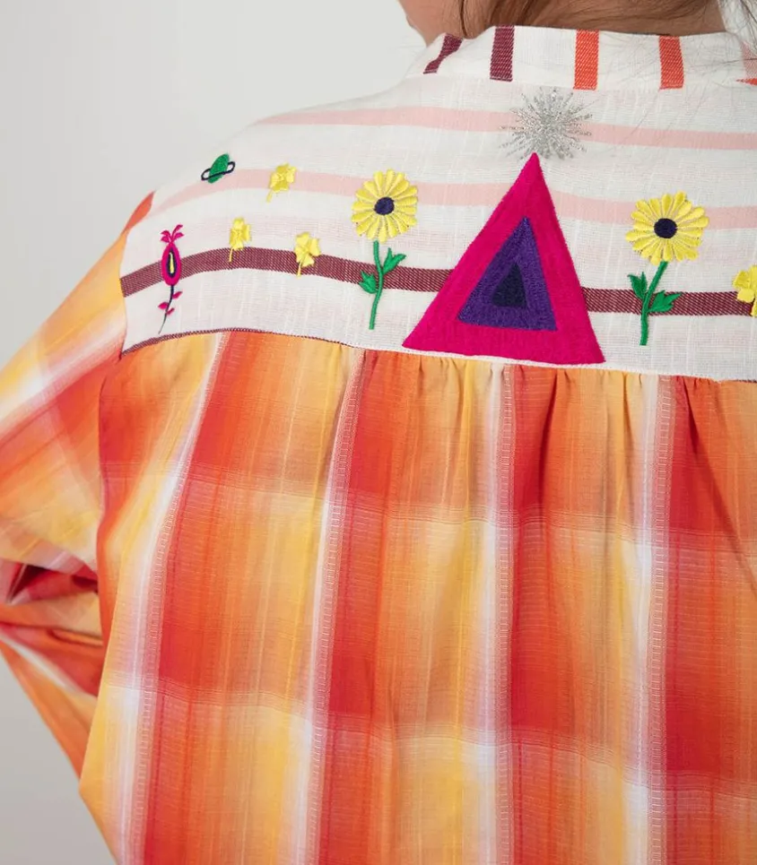 Chemise Fly Spice Red De La Marque Monoki, Un Design Haut En Couleur À L’Inspiration Vintage Et Nomade. Cette Chemise Ample Aborde Un Design Coloré À Carreaux Aux Couleurs Chatoyantes. Le Plastron Et Les Manches Sont Des Empiècements En Tissus Rayé Plus Épais. De Jolies Broderies De Fleurs Et De Planètes Ornent Le Plastron.
