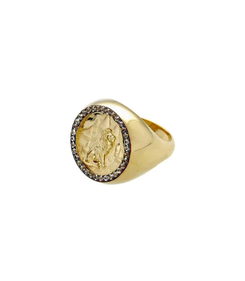Chevalière Lion Feidt Paris, De Forme Ronde En Or Jaune 9 Carats, Comprenant Un Symbolie Lion Gravé Au Centre, Entouré De 35 Saphirs Blancs. Une Pièce D’Une Rare Préciosité Qui Apportera Lumière Et Caractère À Vos Tenues.