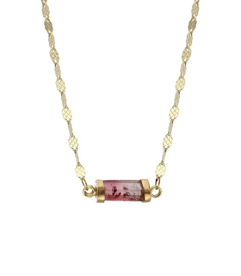 Collier Bess 5 Octobre En Or 14 Carats Et Tourmaline, Une Pièce Délicate Et Précieuse Avec Sa Jolie Pierre Tourmaline Cylindrique Épaisse À La Teinte Rosée. Sa Chaîne Facettée Se Compose De Maillons Gravés Pour Refléter Encore Davantage La Lumière.