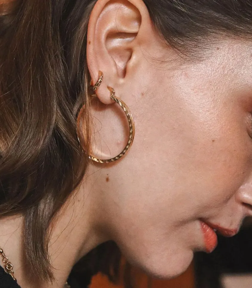 Ces Créoles Se Distinguent Par Leur Centre Plat Et Leurs Bords Striés, Offrant Un Équilibre Parfait Entre Simplicité Et Sophistication. Fabriquées En Plaqué Or 3 Microns De Haute Qualité, Elles Bénéficient D’Une Finition Brillante Et Durable Qui Attire Les Regards.