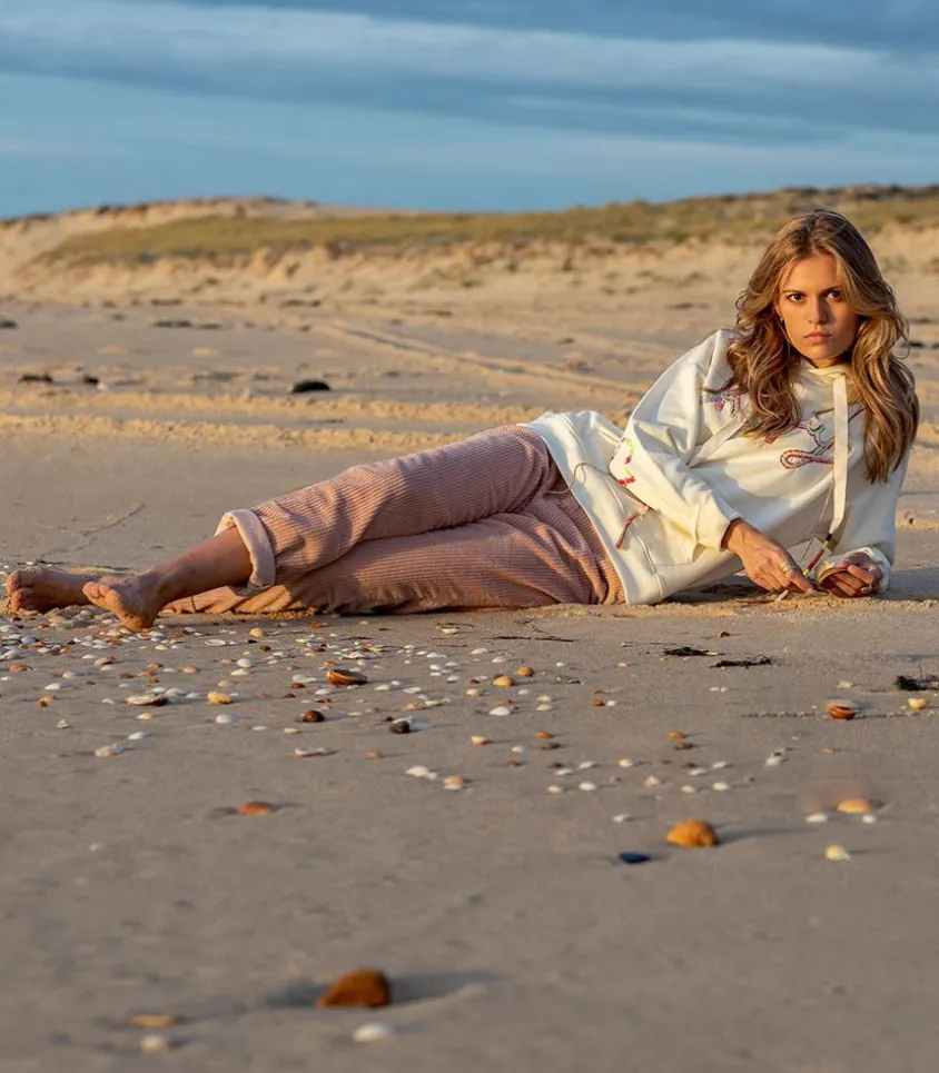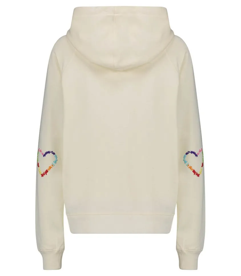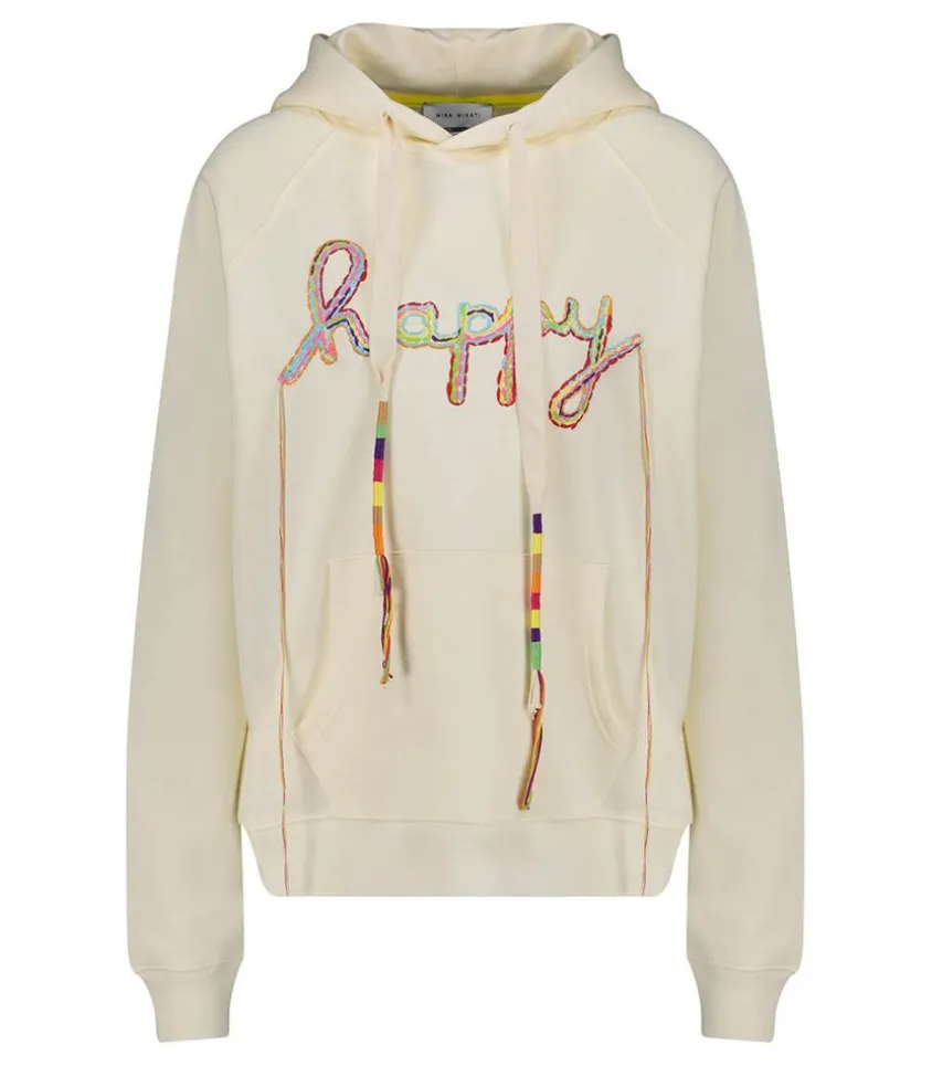 Hoodie Happy Brodé De La Marque Mira Mikati, Un Sweat-Shirt À Capuche Issu De La Collection Aw23 Qui Se Distingue Par Son Message Brodé « Happy » Dans Une Myriade De Fils Lâches Colorés, Accompagné D’Un Cordon Enroulé À La Main Et D’Une Broderie De Cœur Arc-En-Ciel À Chaque Coude. Poche Kangourou.