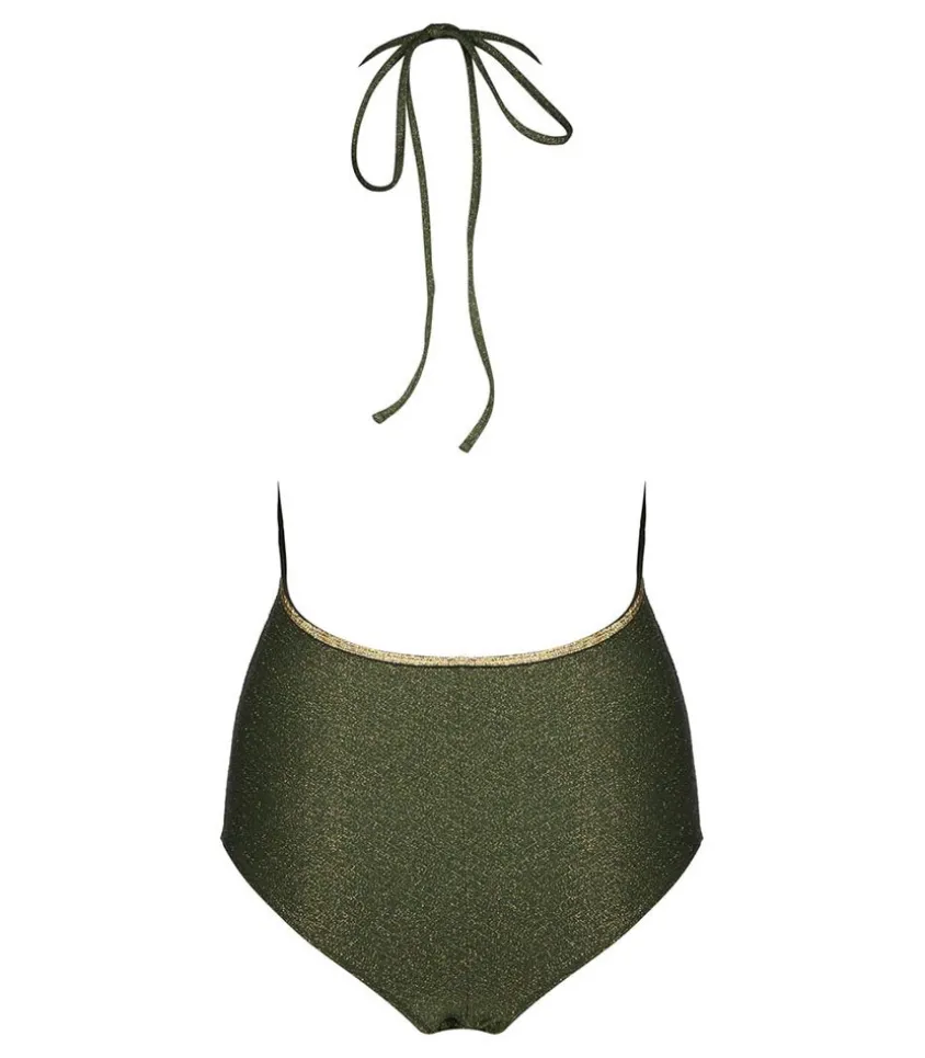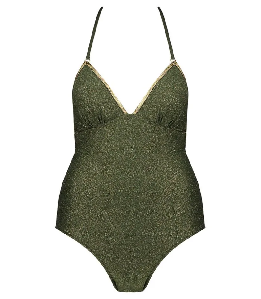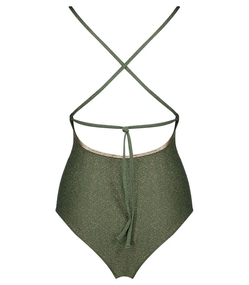 Maillot De Bain Une Pièce Gilda Kaki De La Marque La Nouvelle, Une Pièce Chic Et Sophistiquée Qui Permet Différents Types De Nouages : Croisé Dans Le Dos Ou En Bretelles Simples Avec Un Noeud.