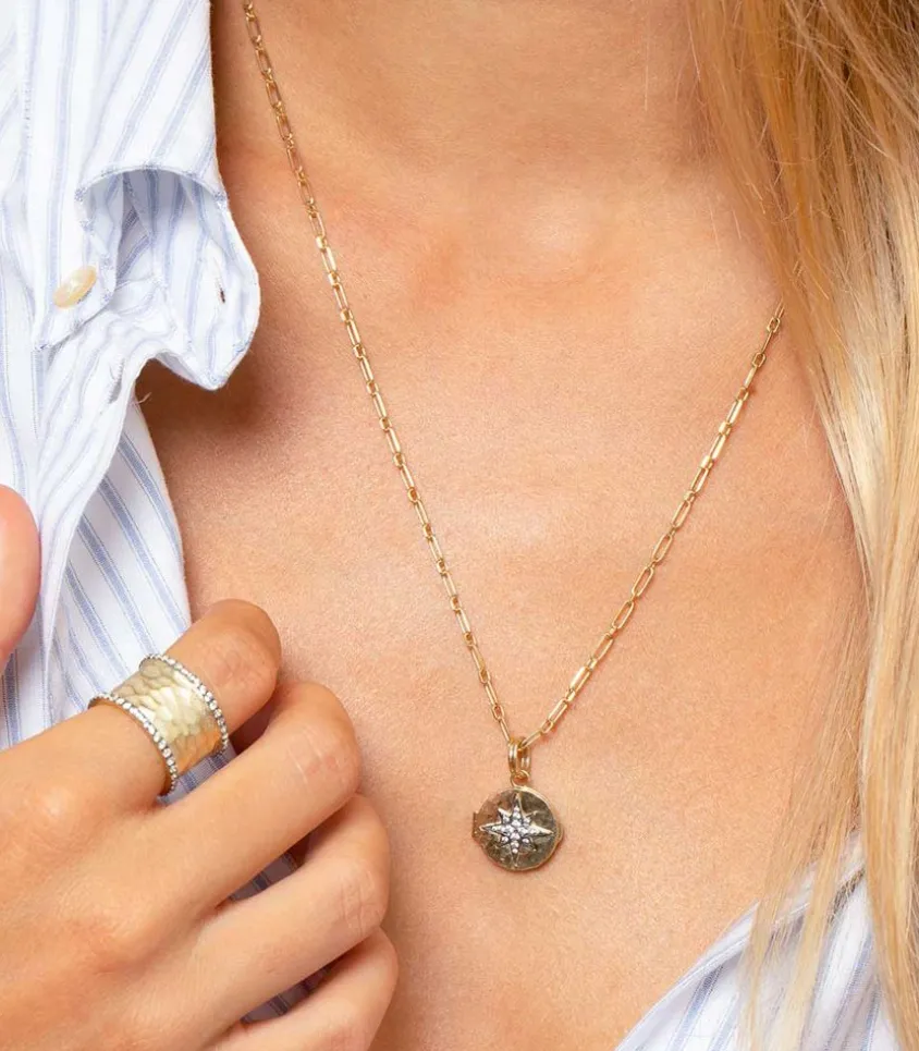 Médaille Une Etoile Est Née Feidt Paris, Un Joli Pendentif Rond En Or Jaune 9 Carats Martelé Avec Une Étoile En Argent Pavée De Saphirs Blancs Au Centre. Ce Médaillon S’Ouvre Pour Laisser Découvrir Le Message Gravé « Une Étoile Est Née » Ainsi Que Des Petites Étoiles Embossées Sur L’Autre Face.
