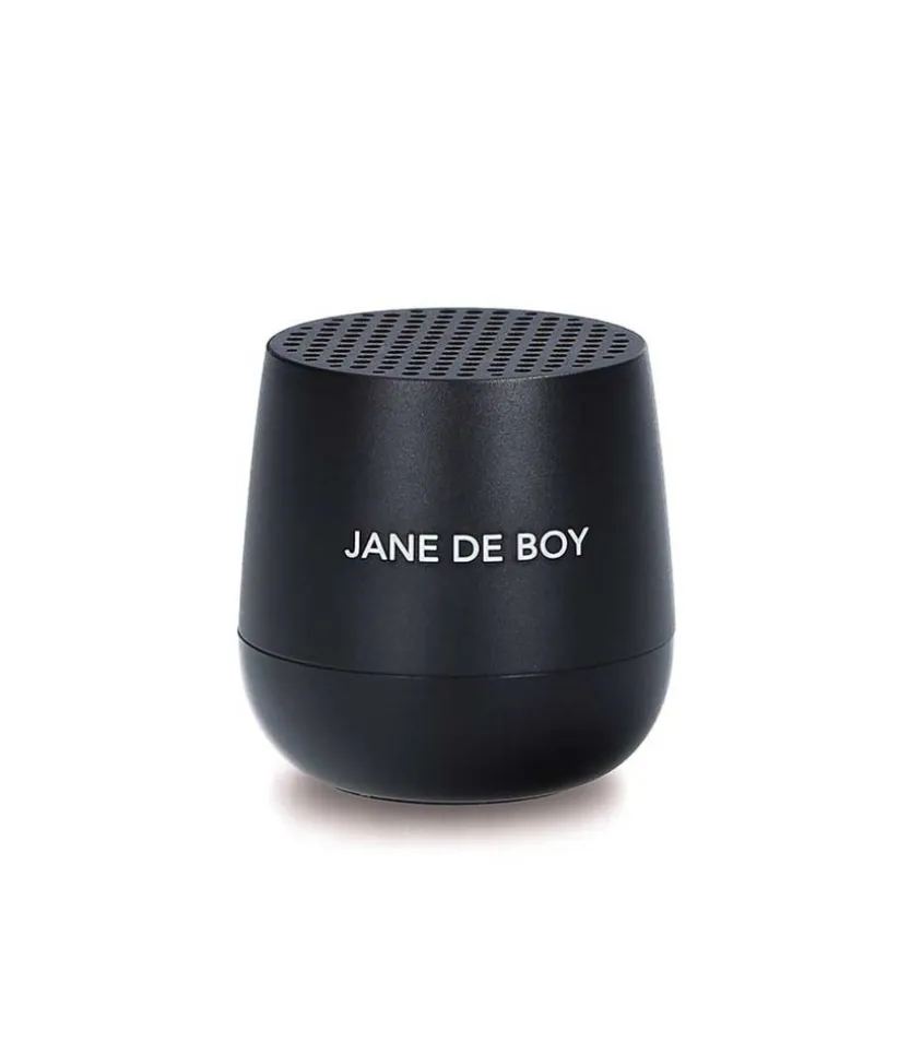 Lexon Et Jane De Boy Présentent La Mini Enceinte Bluetooth Portable Mino, Un Accessoire Rechargeable Au Design Moderne Et Épuré. Cette Enceinte De Couleur Noire Est Équipée D’Un Microphone Et D’Un Déclencheur Pour Selfie.