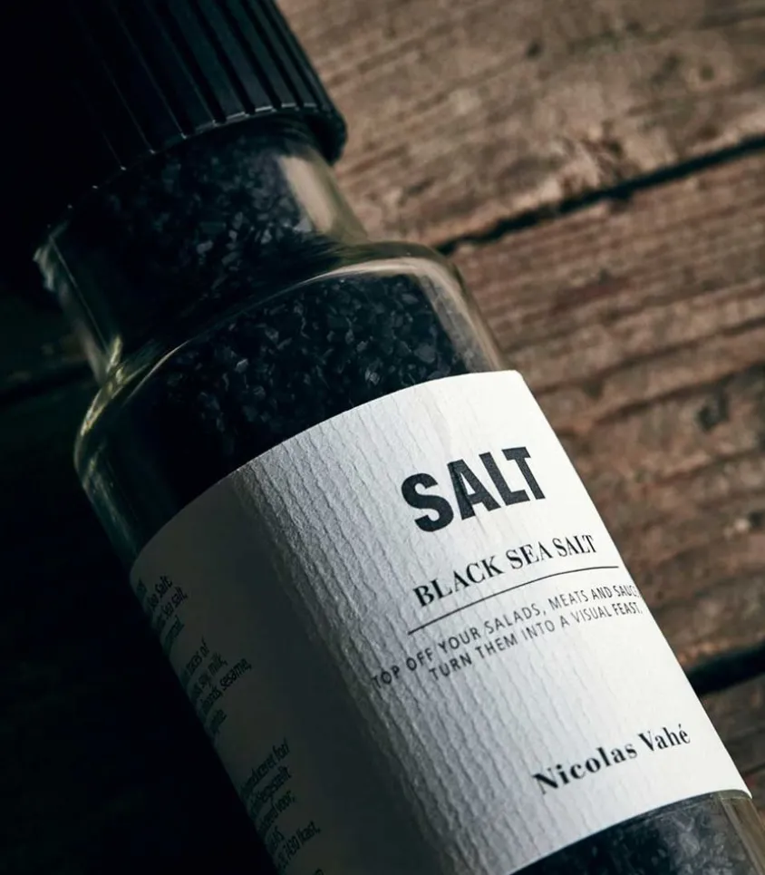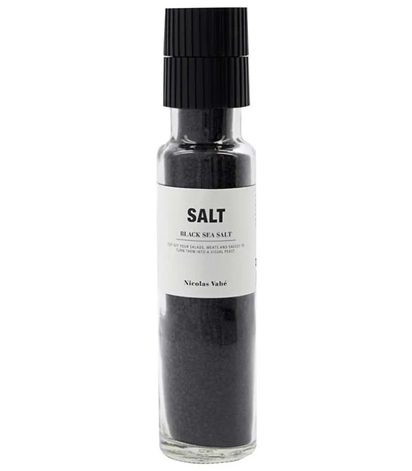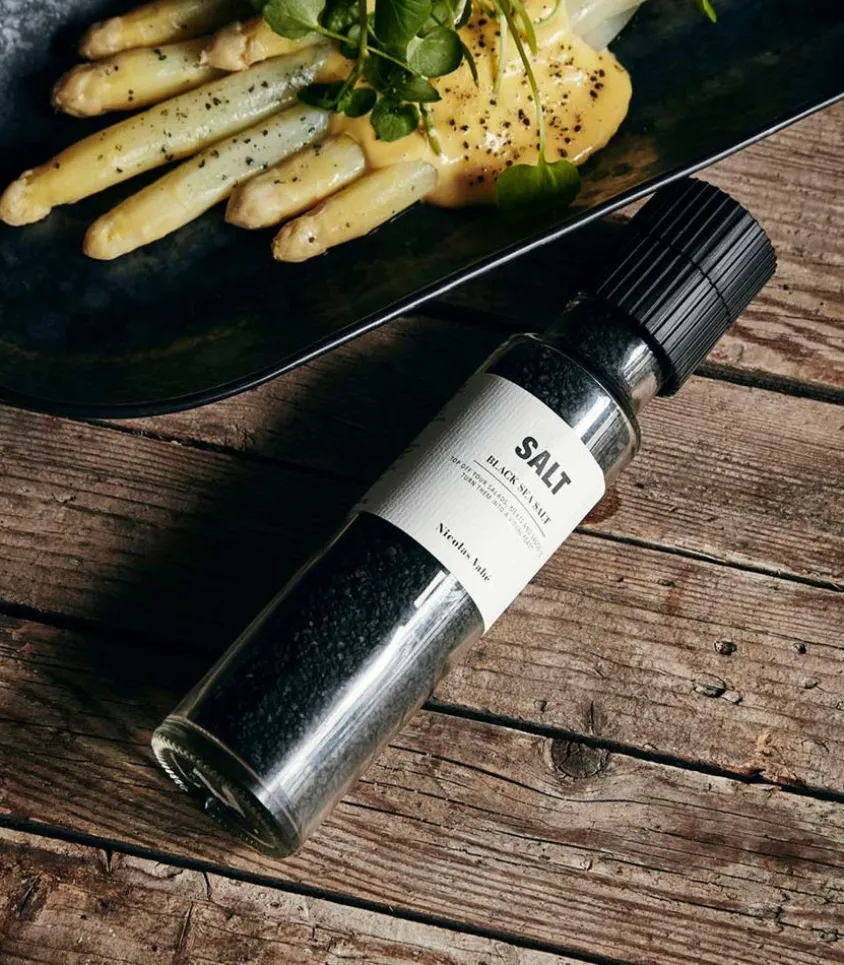 Moulin À Sel Noir Signé Nicolas Vahé, Au Sel Marin Mélangé À Du Charbon Actif. Un Condiment Pourtant Simple, Qui Peut Donner Tout Le Relief À Un Plat Avec Sa Couleur Élégante Et Contrastante.
