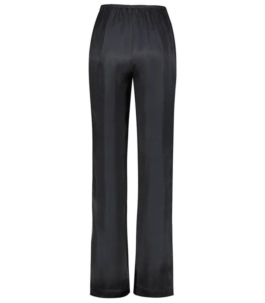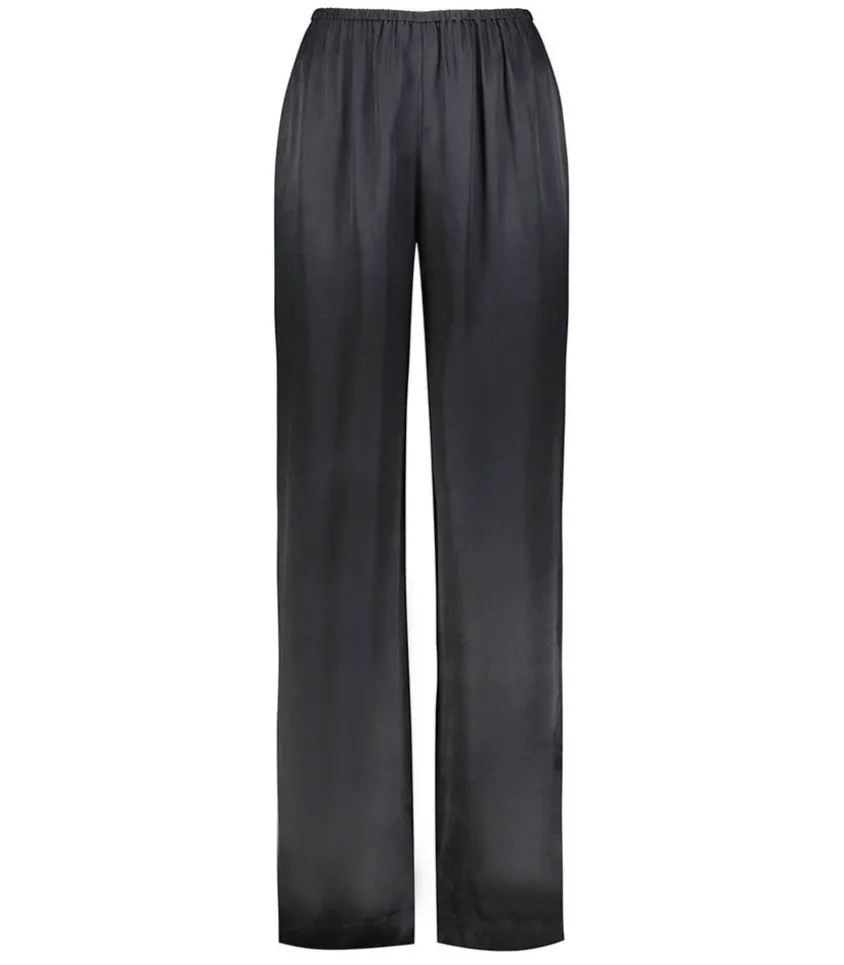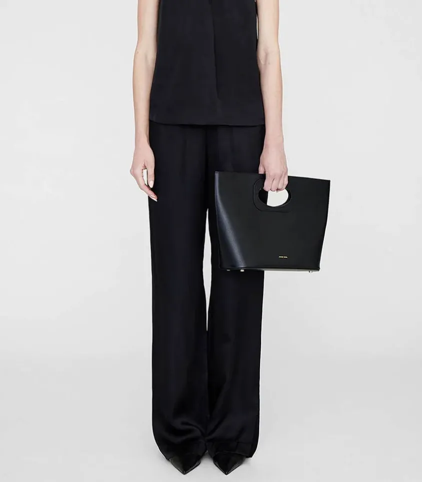 Pantalon Aden Noir De La Marque Anine Bing, Confectionné Dans Un Somptueux Mélange De Soie Double Face, Avec Un Fini Drapé Et Semi-Brillant. Taille Élastiquée Épurée Avec Plis Élégants Et Fentes Latérales. Voir La Taille Du Mannequin
