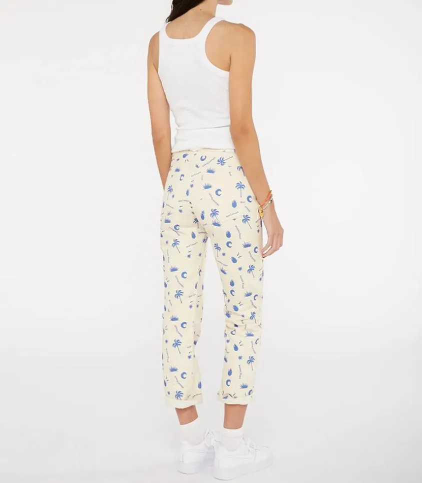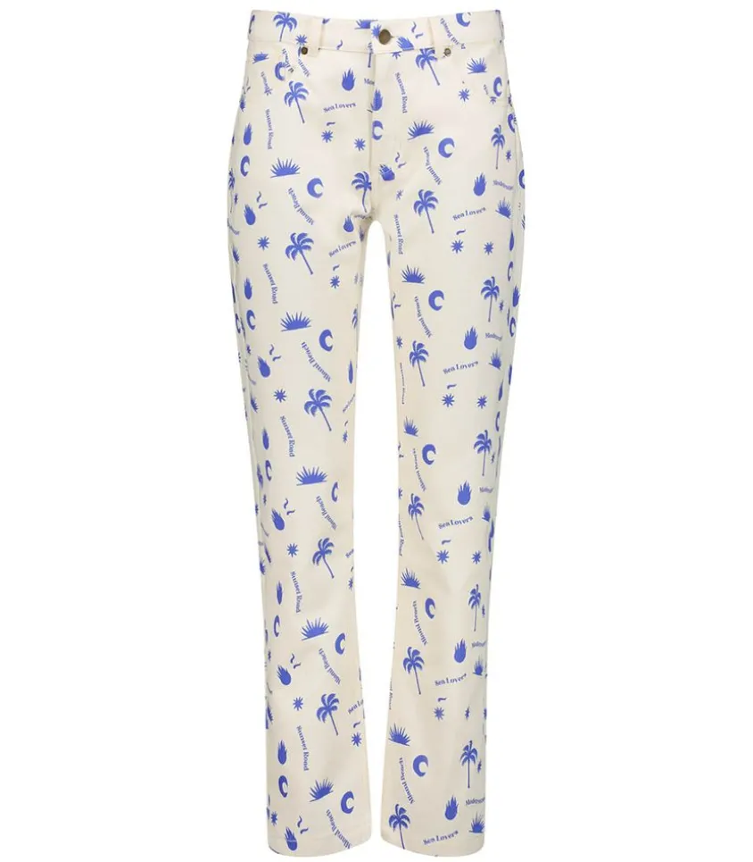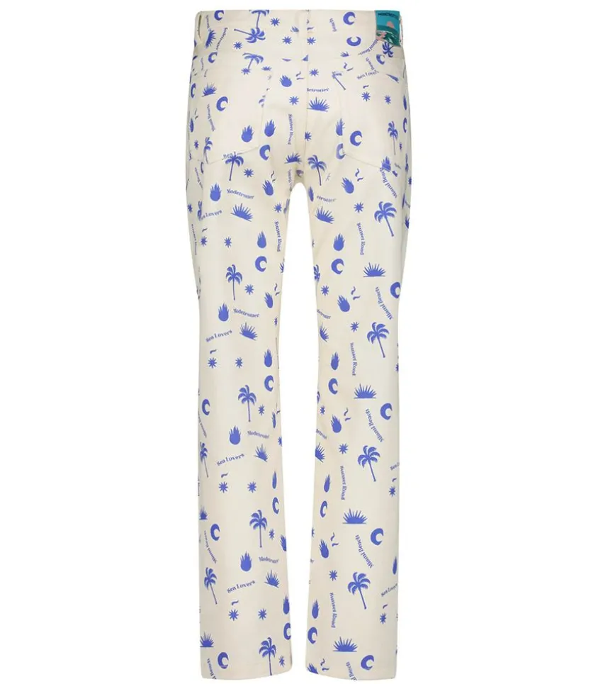 Pantalon En Denim Écru Elias Sea Motifs De La Marque Modetrotter, Une Pièce Originale À L’Esprit Rétro Avec Sa Toile Ponctuée De Petits Imprimés Bleus Inspirés Du Bord De Mer.