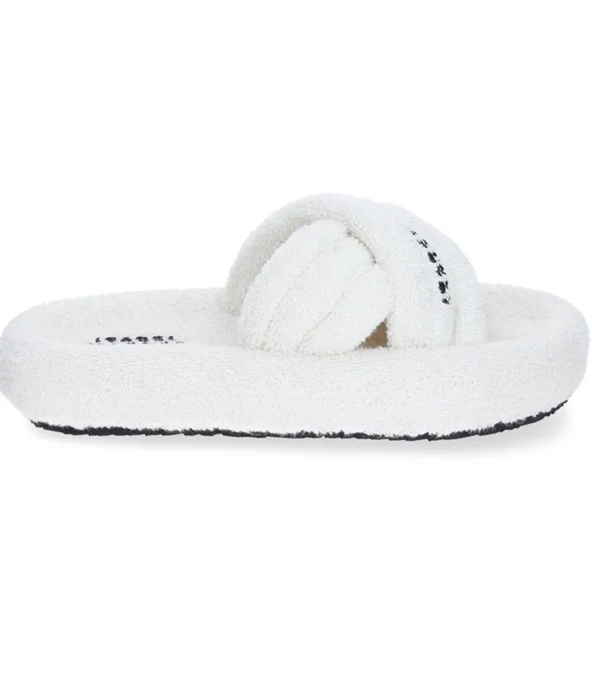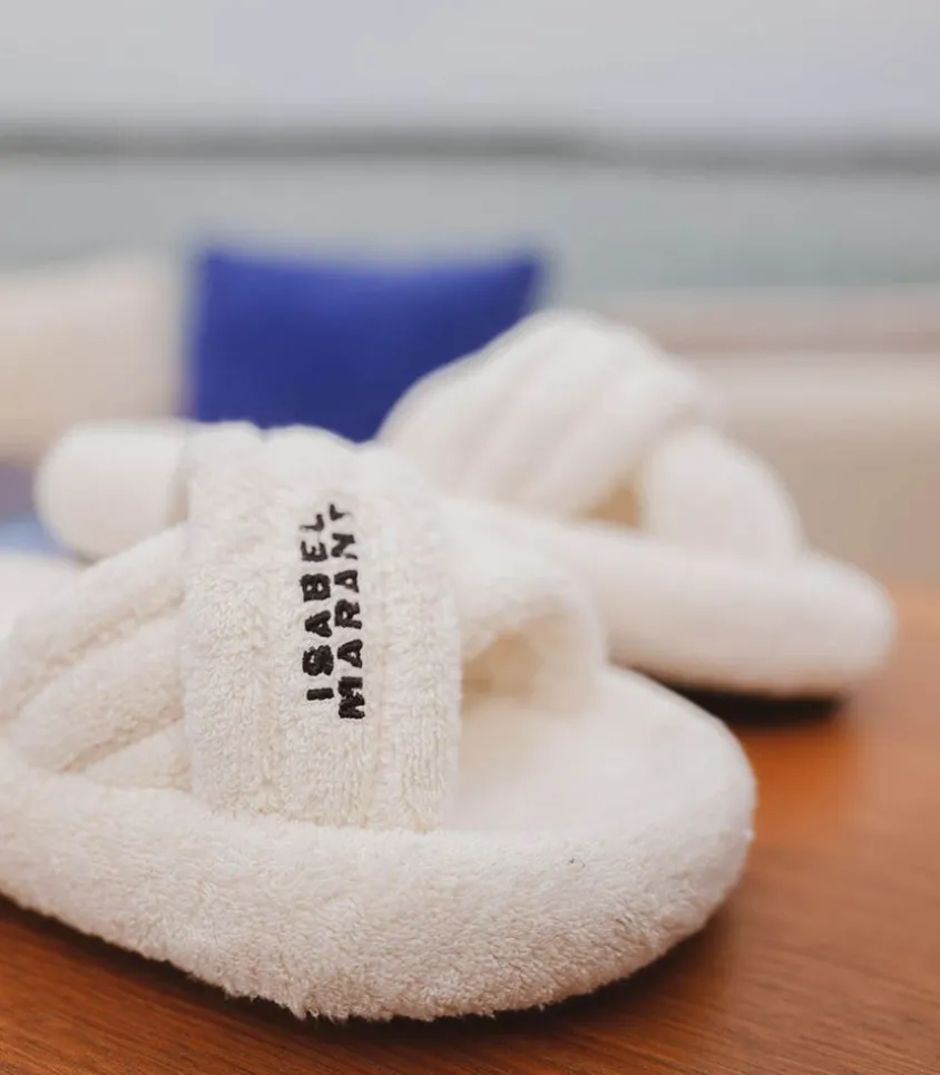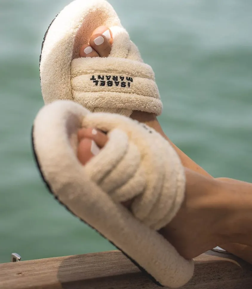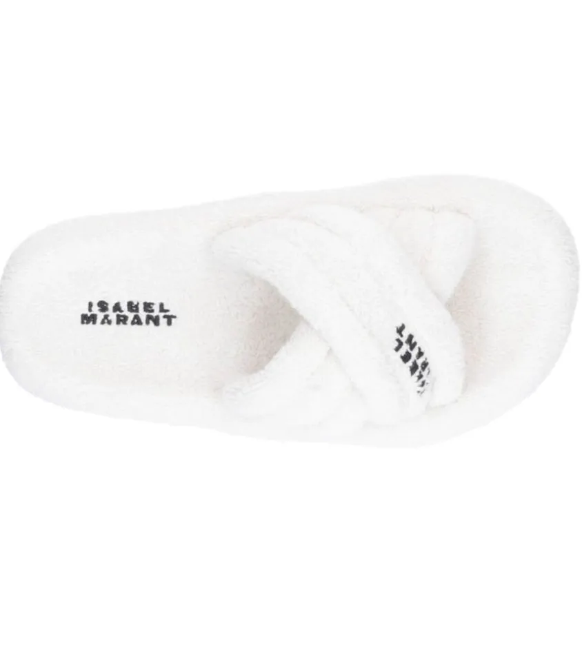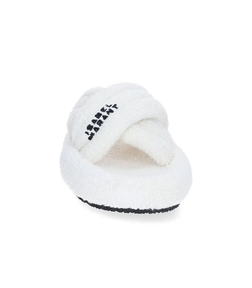 Sandales Niloo En Éponge Écru Par Isabel Marant, Une Paire De Sandales Plates À Enfiler, Confectionnées En Coton Éponge Écru. Leur Bout Rond Et Leur Conception Comme Matelassée Leur Confère Un Aspect Moelleux Et Confortable.