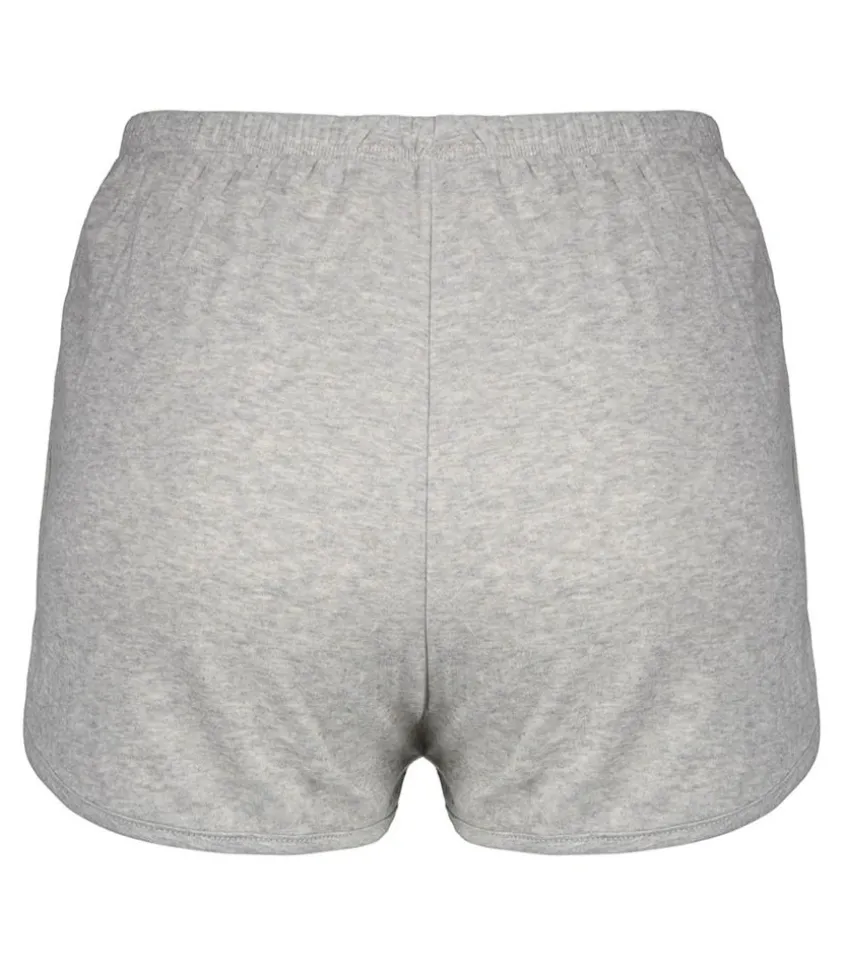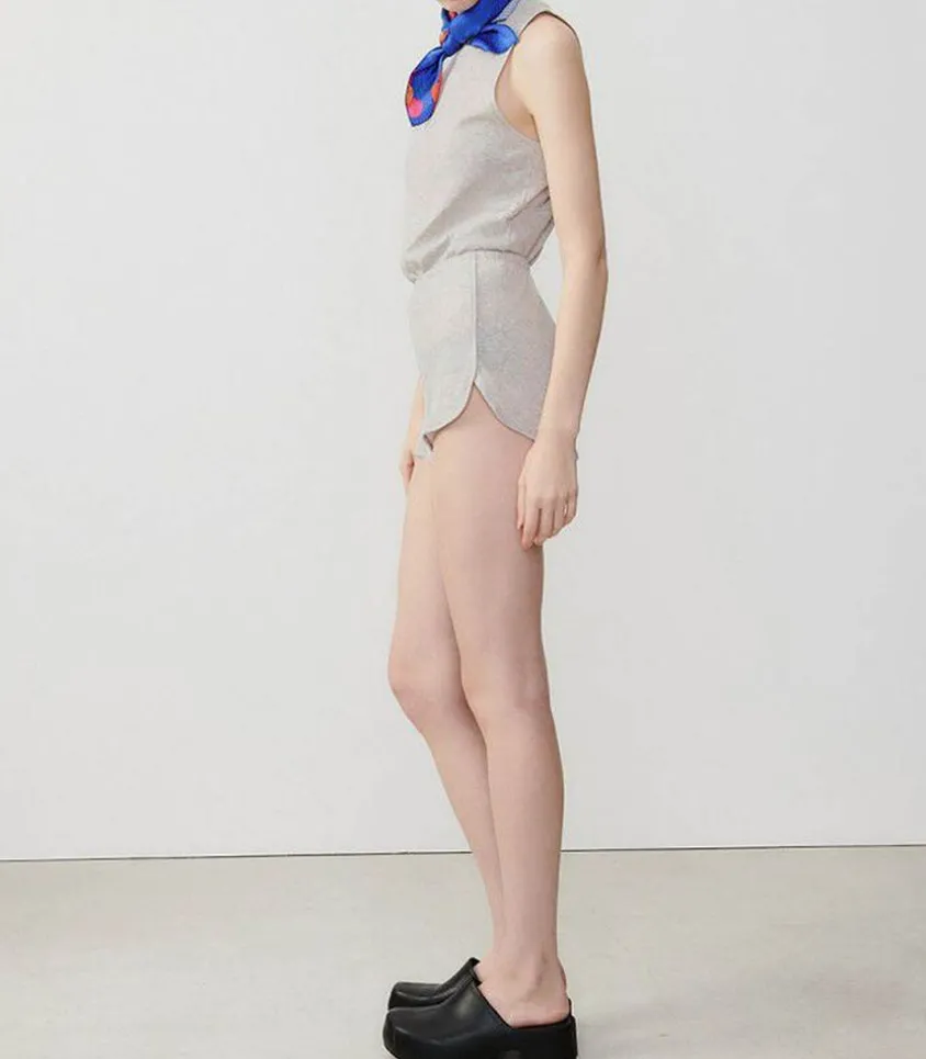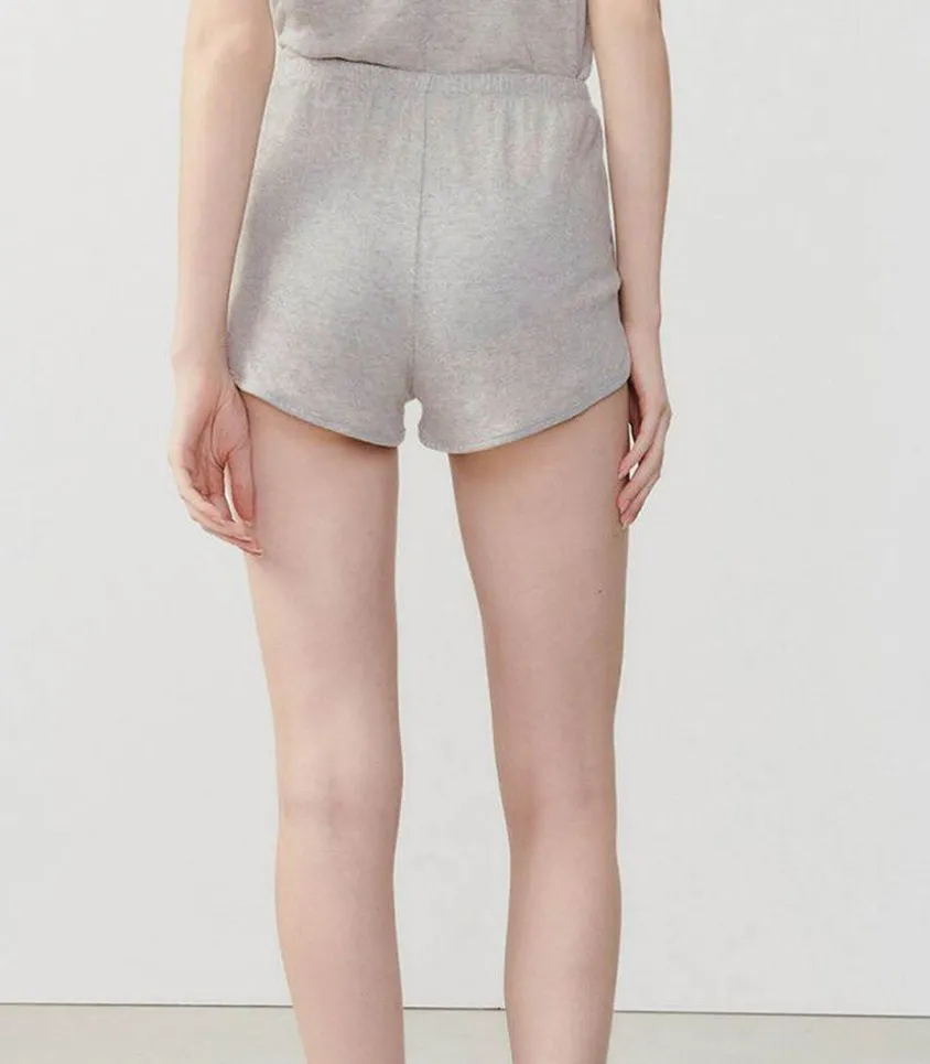 Short Confortable Pour Femme Ruzy Gris Clair Chiné De La Marque American Vintage. Esprit Sportswear Avec Petits Bords Arrondis Et Petites Fentes Sur Les Côtés. Ceinture Fine Élastiquée.