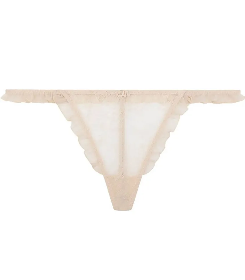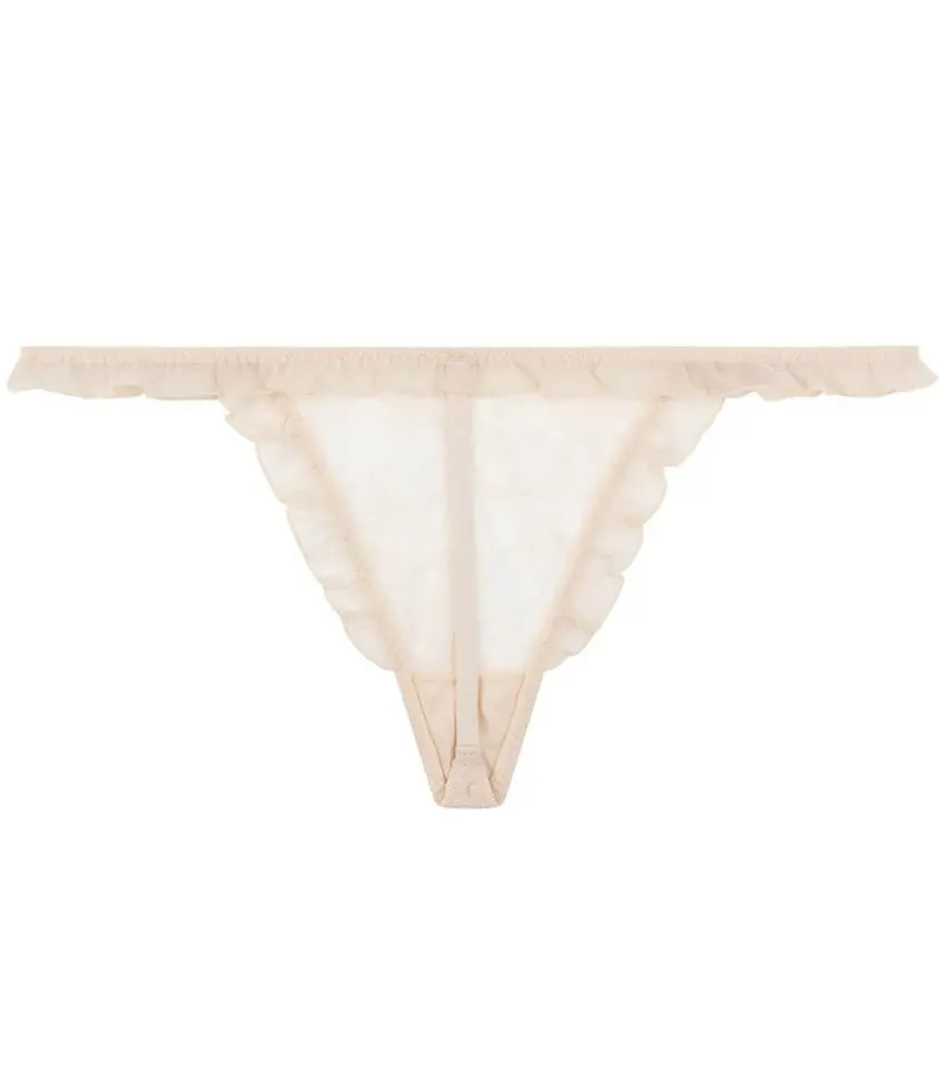String Francesca Off White De La Marque Love Stories, Un String De Couleur Blanc Cassé En Dentelle Délicate Extensible À Motif Floral. Une Bordure Volantée En Maille Ton Sur Ton Recouvre La Ceinture Et La Jambe. L’Arrière Du String Offre Une Couvrance Minimale.