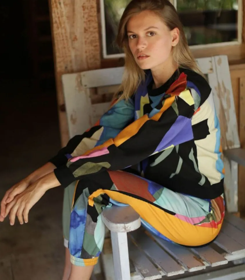 Sweat-Shirt Jaguar Crop De La Marque G.Kero, Un Modèle À La Coupe Carrée Pour Femme. Porté Avec Un Bas Taille Haute, Il Mettra En Valeur La Silhouette. Dessin Formes Abstraites Colorées Sur Fond Noir.