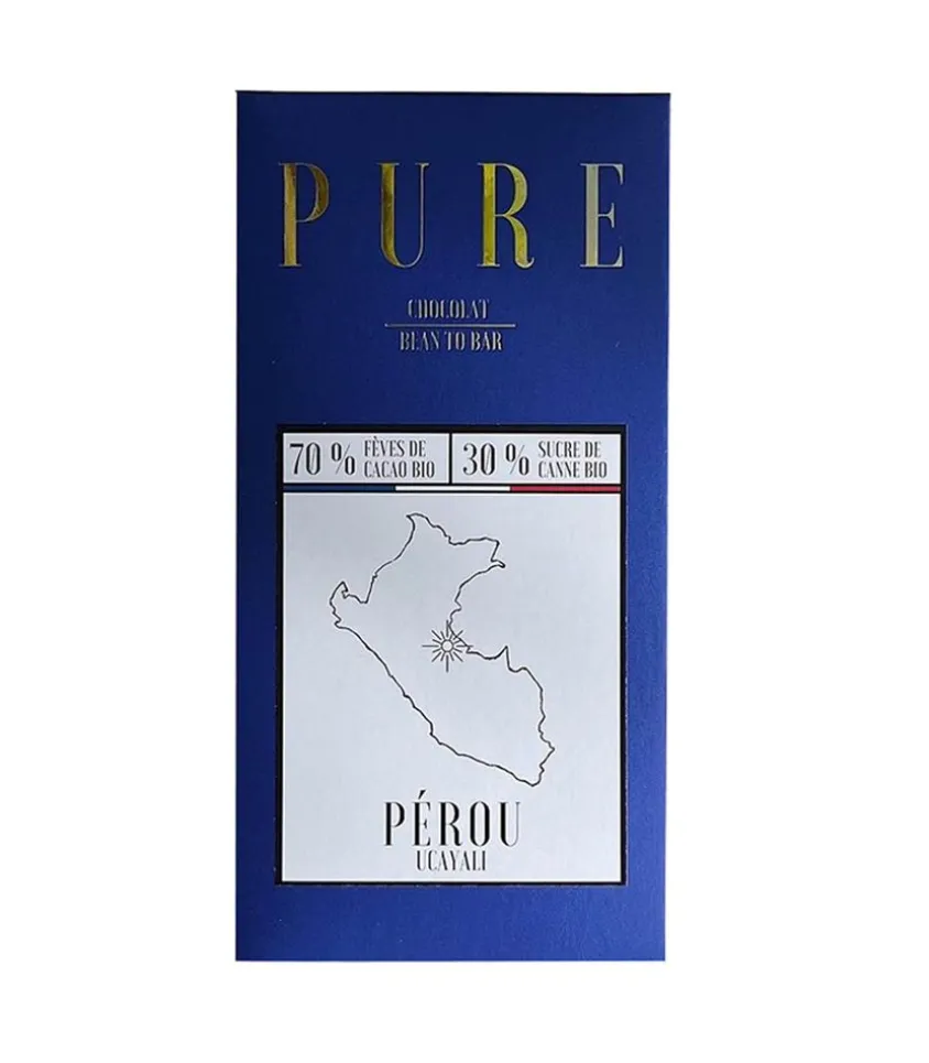 Tablette De Chocolat Bio 70% De La Marque Pure. Une Tablette « Bean To Bar », Dont Les Fèves, Provenant Du Pérou Dans La Région D’Ucayali, Ont Été Minutieusement Sélectionnées, Triées, Torréfiées, Concassées, Broyées Et Conchées Pendant Plusieurs Heures Pour Obtenir Un Chocolat Unique, Riche En Goût Et En Arômes Naturels.